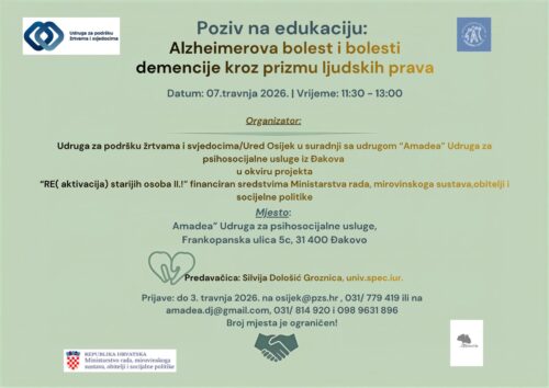 Udruga za podršku žrtvama i svjedocima/ Ured Osijek u suradnji s udrugom “Amadea” iz Đakova Vas poziva na edukaciju naziva “Alzheimer i bolesti demencije kroz prizmu ljudskih prava” koja će se održati 7. travnja 2026.godine u prostoru Udruge “Amadea” Udruga za psihosocijalnu pomoć u Đakovu, Frankopanska 5c, 31 400 Đakovo s početkom u 11:30 h.