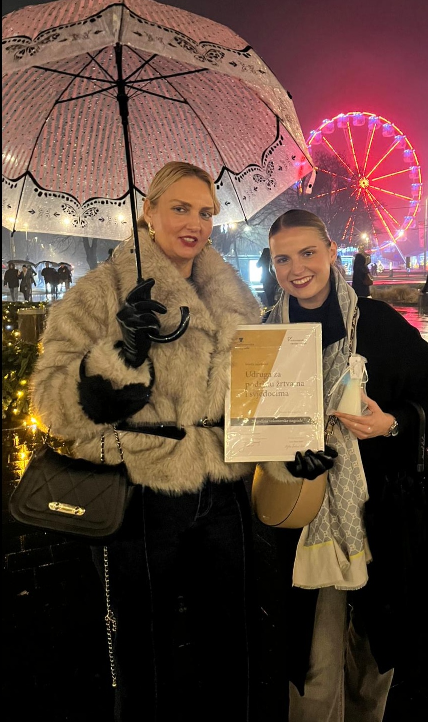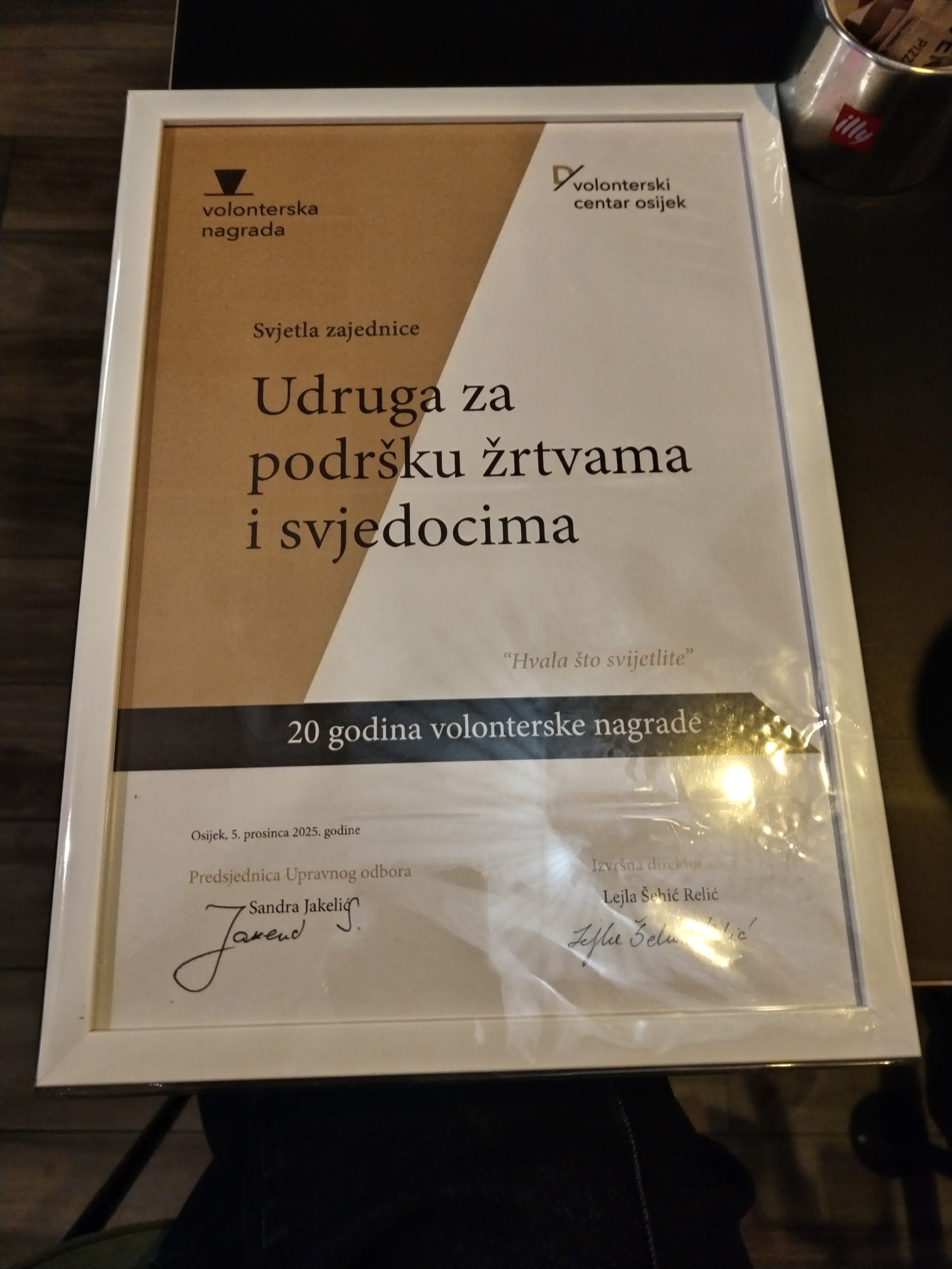 Marjana Skoko voditeljica Ureda Osijek i koordinatorica volontera Ureda i volonterka Nikolina Knežević preuzele su nagradu u obliku posebnog priznanja Udruzi za podršku žrtvama i svjedocima povodom 20 godina volonterskih nagrada -Svjetla zajednice- “Hvala što svijetlite”.