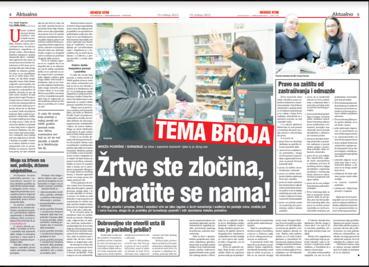 Voditeljicu ureda Varaždin Barbaru Oreški i voditeljicu Savjetovališta za žrtve obiteljskog nasilja Varaždin Paulu Pernek intervjuirale su Međimurske novine s ciljem informiranja javnosti o mogućnosti i dostupnosti pomoći i podrške na području Varaždinske i Međimurske županije.