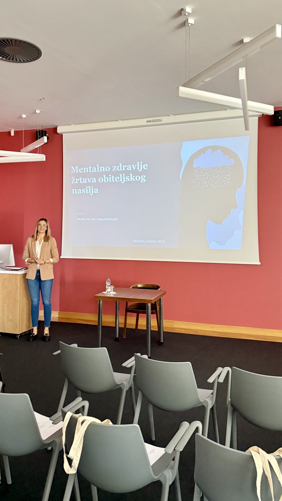 Dana 22. travnja 2026. godine u prostorijama Gradske knjižnice i čitaonice „Metel Ožegović“ Varaždin održana je edukacija pod nazivom „Mentalno zdravlje žrtava obiteljskog nasilja“ u sklopu provedbe projekta Savjetovalište za žrtve nasilja u obitelji – Varaždin, financiranog sredstvima Ministarstva rada, mirovinskog sustava, obitelji i socijalne politike Edukaciju je vodila Melita Horvat, mag. psych.
