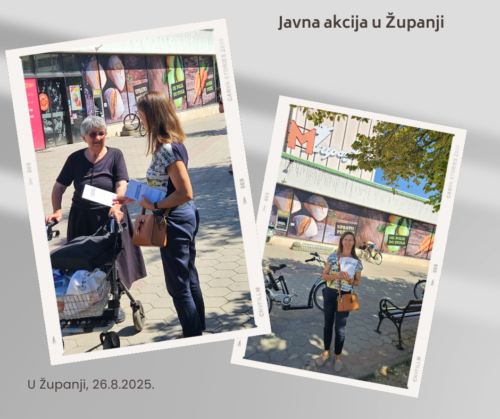 26. kolovoza 2025. godine održali smo javnu akciju u Županji. Za vrijeme trajanja javne akcije podijelili smo letke tiskane u okviru projekta i informirali građane o našim uslugama. Na javnoj akciji sudjelovale su izvoditeljica aktivnosti ispred ureda Vukovar, Melita Bošnjak i volonterka Ljubinka Vuletić Vuković.