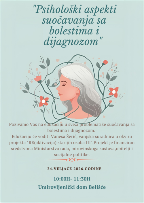 24. veljače 2026.godine u sklopu projekta održali smo psihološku edukaciju u Matici umirovljenika u Belišće naziva “Psihološki aspekti suočavanje s bolestima i dijagnozom”. Edukaciju je vodila naša dugogodišnja suradnica Vanesa Šerić, dok je projekt predstavila voditeljica projekta Marjana Skoko.