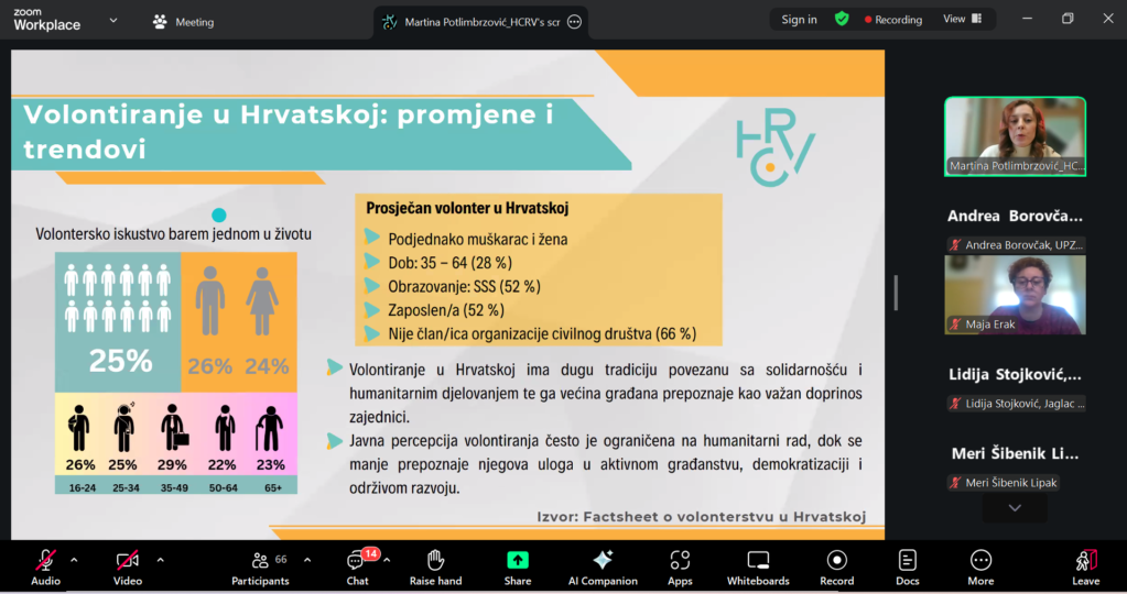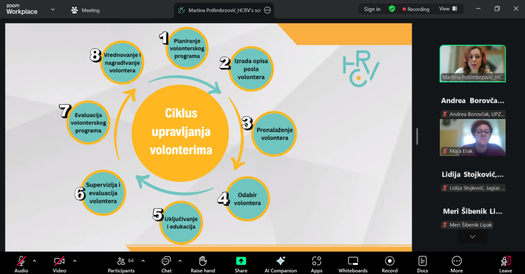 Hrvatski centar za razvoj volonterstva organizirao je 16. veljače 2026. webinar pod nazivom Upravljanje volonterima i volonterskim programima u suvremenom kontekstu namijenjen volonterskim centrima i organizatorima volontiranja koji žele bolje razumjeti suvremene trendove u volontiranju te mogućnosti prilagodbe volonterskih programa promjenjivim interesima, motivacijama i načinima uključivanja volontera, kroz prikaz primjera dobre prakse.